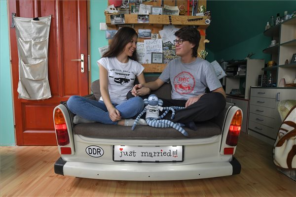Mátó Zoltán és felesége, Mátóné Tonhajzer Arabella egy Trabant csomagtartójából kialakított kanapén ül tiszaújvárosi otthonukban 2017. november 3-án. Hatvan éve, 1957. november 7-én hagyta el a kelet-németországi zwickaui autógyárat az első Trabant gépkocsi. MTI Fotó: Czeglédi Zsolt