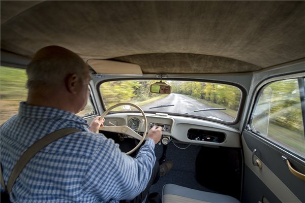 Marosi Károly vezeti 1963-as évjáratú Trabant 600-as autóját Szilágy közelében 2017. november 5-én. Hatvan éve, 1957. november 7-én hagyta el a kelet-németországi zwickaui autógyárat az első Trabant gépkocsi. MTI Fotó: Sóki Tamás