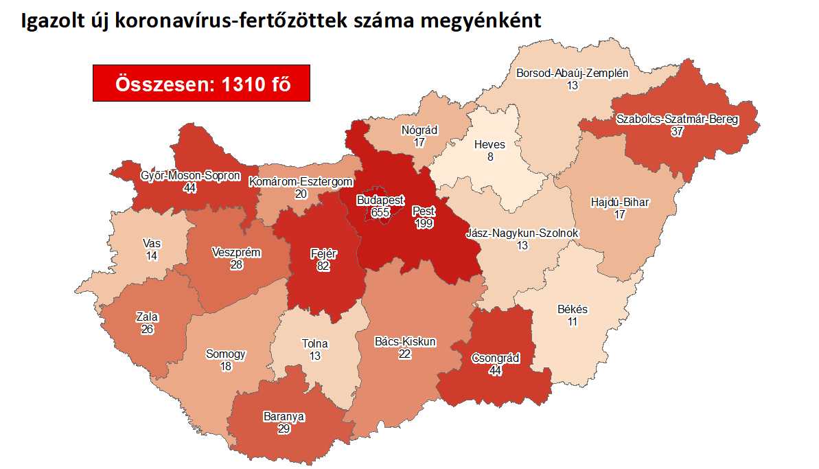 Újabb magyar állampolgároknál mutatták ki az új koronavírus-fertőzést (COVID-19), ezzel 1310 főre nőtt a hazánkban beazonosított fertőzöttek száma. Elhunyt újabb 8 beteg. Ezzel 85 főre emelkedett az elhunytak száma. 115 fő pedig már gyógyultan távozott a kórházból. A Pesti úti idősek otthonában eddig összesen 198 igazolt koronavírus-fertőzött van.
