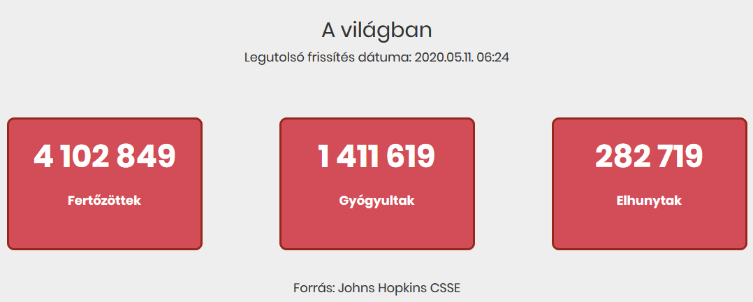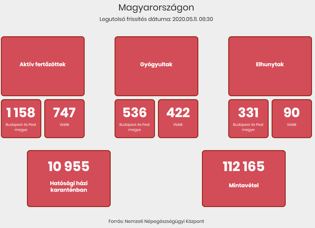 Az oldal térképe alapján továbbra is Budapesten (1587 ember) és Pest megyében (438) van a legtöbb fertőzött. Ezt követi Fejér megye (333), Komárom-Esztergom (173), Zala (170) és Csongrád megye (107). Vas megyében (14) van a legkevesebb fertőzött Magyarországon.