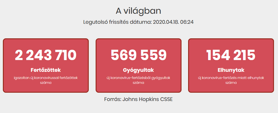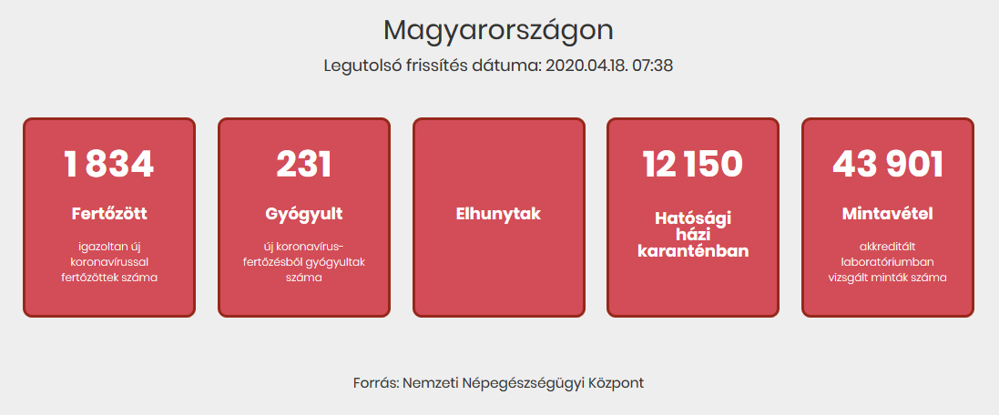 Az oldal adatai szerint 12 150-en vannak hatósági házi karanténban. Az eddig elvégzett mintavételek száma 43 901.