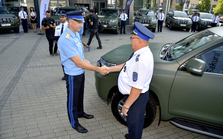 A Toyota Central Europe képviseletében László Richard országigazgató arról beszélt, hogy a Toyota Land Cruiser a világ egyik legnagyobb múltú nehézterepjárója, több mint 10 millió darab készült belőle, és 1951 óta gyártják. Ez a típus a legextrémebb körülmények között is helyt áll az afrikai sivatagoktól a sarkvidékeken át az esőerdőkig - folytatta, reményét fejezve ki, hogy a rendőrség is évtizedekig fogja tudni használni a most átadott járműveket.