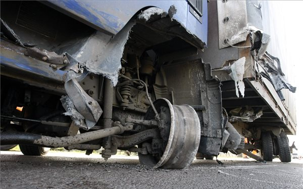 Megsérült futóművel álló teherautó a 31-es főúton Jászberény és Nagykáta között 2014. március 10-én. A jármű frontálisan ütközött egy személygépkocsival, melynek vezetőjét életveszélyes sérülésekkel vitték kórházba.