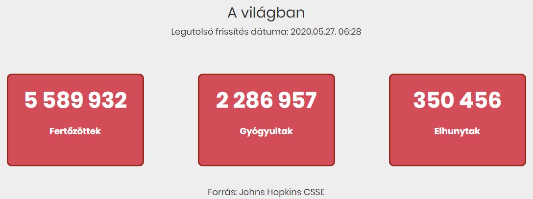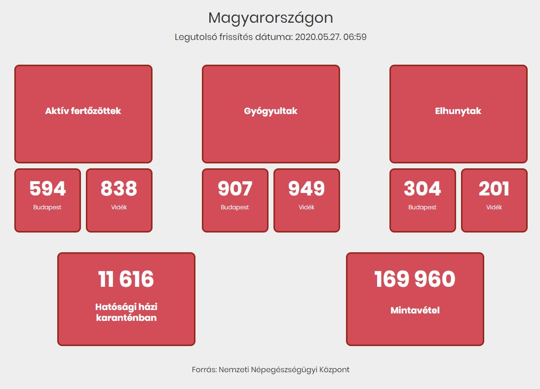 Újabb 22 magyar állampolgárnál mutatták ki az új koronavírus-fertőzést (COVID-19), ezzel 3793-ra nőtt a hazánkban beazonosított fertőzöttek száma. Elhunyt újabb 6 idős krónikus beteg. Ezzel 505-re emelkedett az elhunytak száma, 1856-an pedig már gyógyultan távoztak a kórházból.